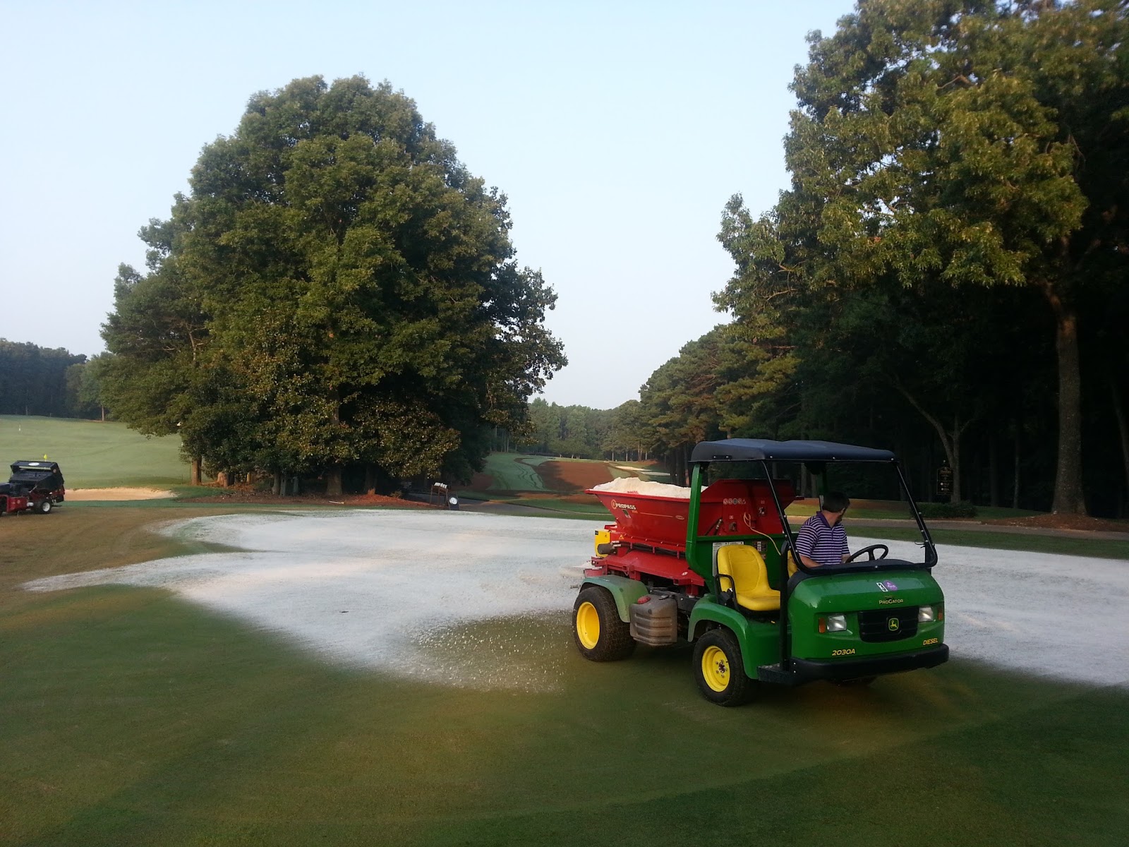 It has been quite some time since our last post to the blog. I can promise you that it is not because we have not been doing anything, just the opposite in fact. June brought the warmer temperatures and that means the Bermuda grass really takes off. We have been busy with our normal summer maintenance of mowing, blowing, edging, ect. However, this week we are closed to perform Aeration on Green, Perimeters, Tees, and Fairways. We closed on Tuesday of this week and so far we are right on schedule for where I want to be. We finished punching holes on Wednesday afternoon and the clean up process is almost complete. Fairways were double cut yesterday, Greens were rolled this morning and will be mowed for the first time tomorrow morning. Here are just a few pictures, I will be working on a video soon.